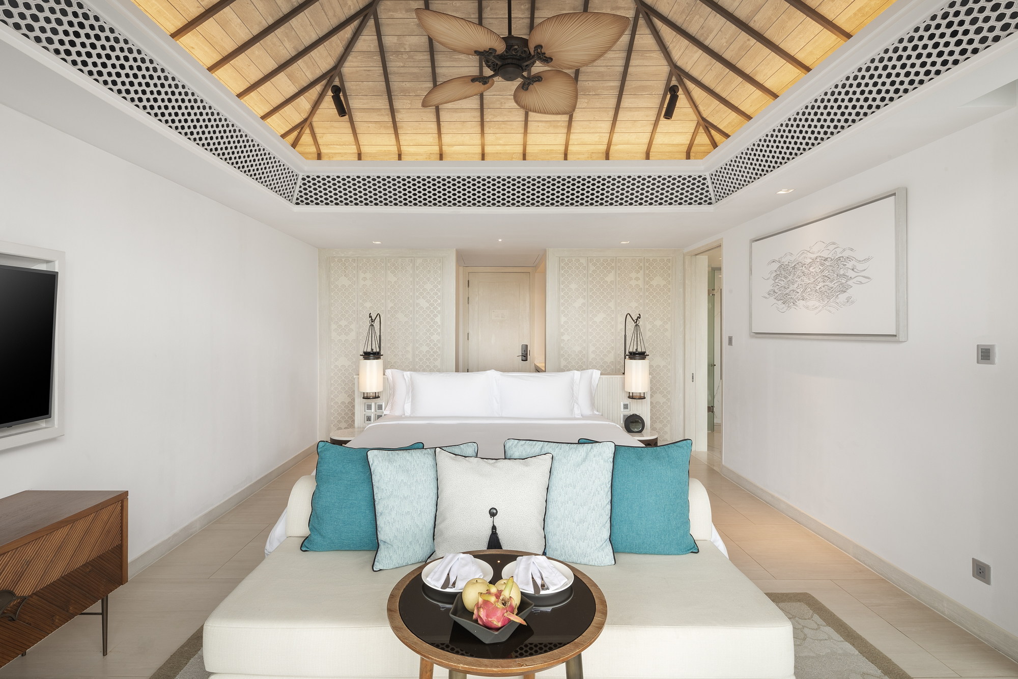 Spread over 99 sqm with a private swimming pool and jet pool, this suite is available with either Twin or King-size beds. Commanding vistas of garden and sea, the terrace makes for sensational sunbathing and outdoor dining experiences. The bathroom has separate toilet and shower, and an oval-shaped tub just a few tip-toes away from the outdoor jet pool. In-room amenities include ambient lighting, a flat screen TV with multilingual channels, and a coffee machine.